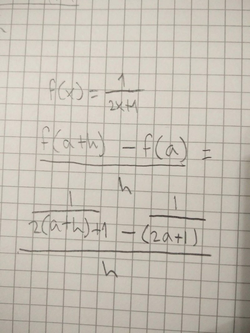 Jag har multiplicerat nämnarna med varandra och har förenklat men vet inte hur jag ska fortsätta. Ska jag fortsätta med att förenkla h:na genom att dividera med h?