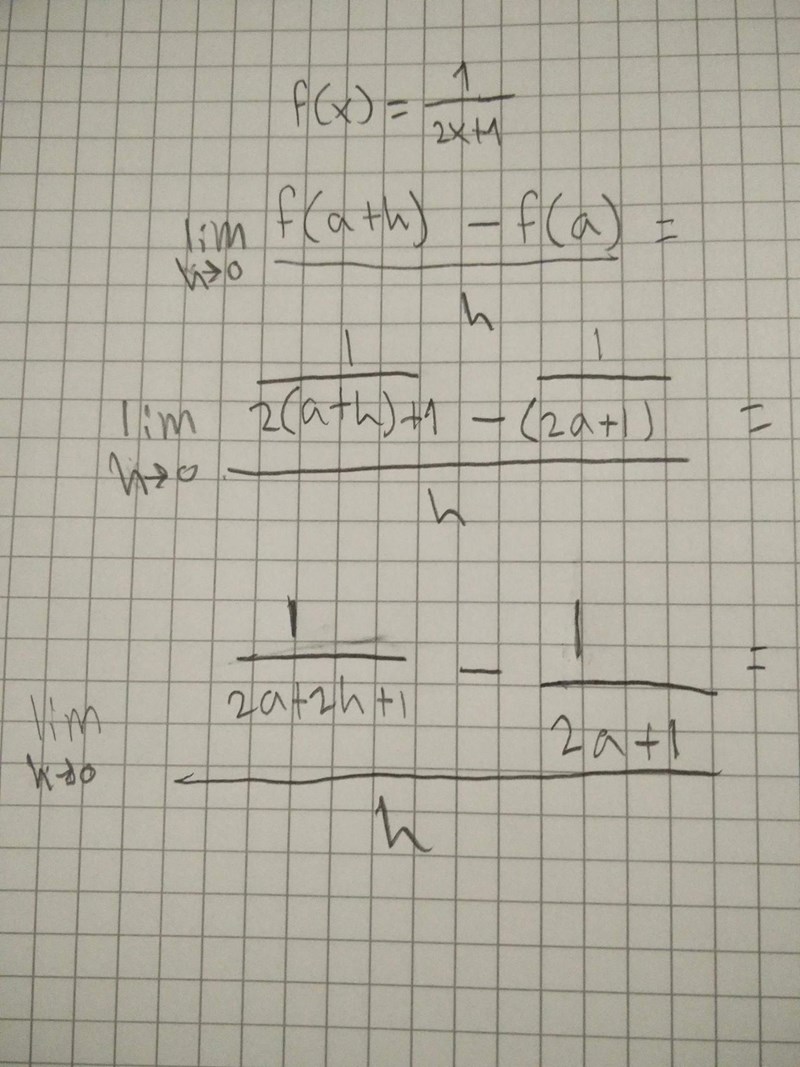 Derivera f (x) = 1/(2x+1) med hjälp av derivatans definition.