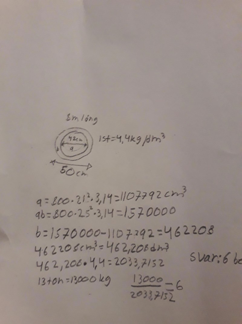 Fråga 3: Ett betongrör är 8 m långt. Ytterdiametern är 50 cm och innerdiametern är 42 cm. Hur många rör kan en lastbil som lastar 13 ton frakta om betongen väger 4,4 kg/dm³. Det är den här jag inte förstår alls. Jag vet inte hur jag ska räkna ut den.