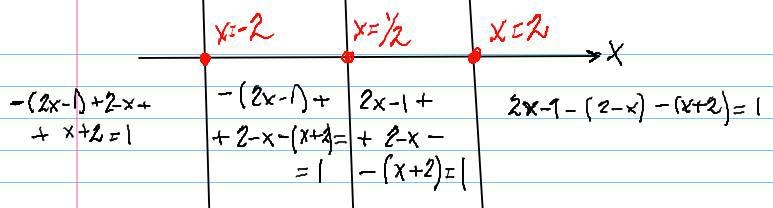 3. De tre punkterna delar tallinjen i fyra intervall. Det betyder att du har fyra olika fall att räkna med (beroende på om det som står inne i dina absolutbelopp är positivt eller negativt). Ställ upp de fyra ekvationerna (-(2x-1)+-(2-x)--(x+2)=1 kommer inte att bli en av dem, för den situationen finns inte).
