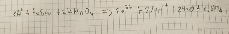 Om man tar bort åskådarjonerna så lyder reaktionen: (FeSO4) + (2KMnO4) --> (Fe^3+) + (2Mn^2+), eller? Ska jag ta bort S och K?