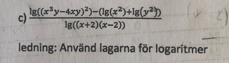 Det jag kom fram till är bilden längst upp, jag undrar även om det är ok att stryka log på det där sättet. Man kan förenkla nämnaren till x^2-4, men annars kan man väll inte förenkla det mer (den här uppgiften ska göras utan miniräknare).