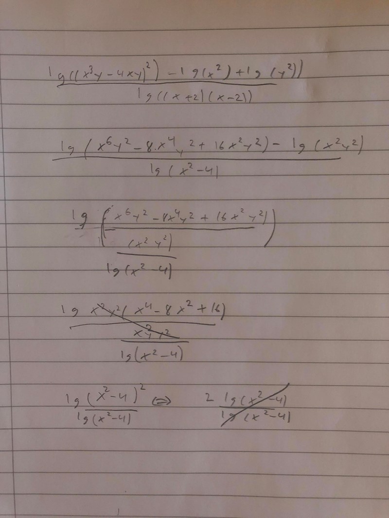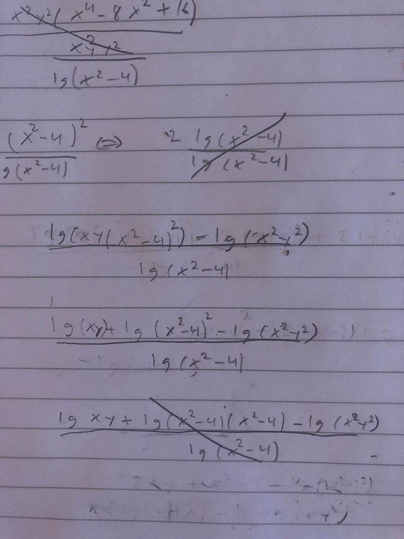Därifrån kan man väll stryka log, och sedan bryta ut xy så att det blir xy(x^2-4)^2/xy(xy)/x^2-4