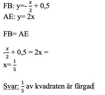 AmiKris skrev:Aloosher skrev:Om jag har fattat rätt så har du räknat ut är att vid x = 1/5 så korsas FB och AE? Har jag rätt?