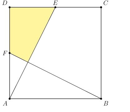 I kvadratenABCD är E och F mittpunkter på sidorna CD respektive AD. Hur stor andel av kvadraten är färgad? Svara i enklaste bråkform
