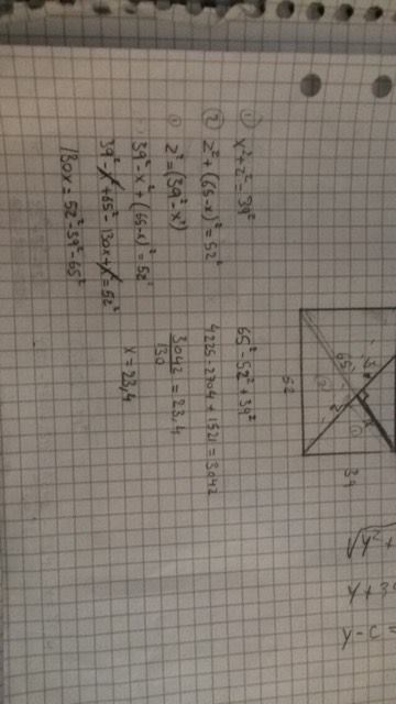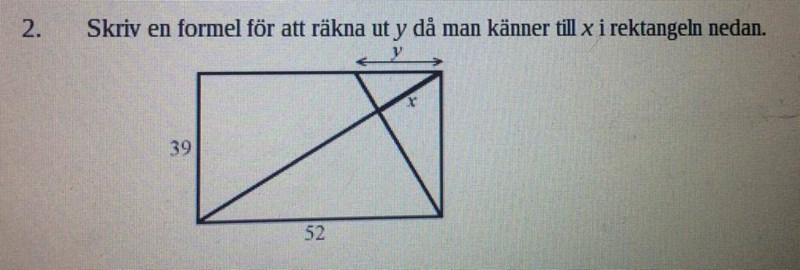 För det första fattar jag inte om jag skall räkna ut x och y eller om jag bara skall skriva själva formeln för att räkna ut dem? Sen har jag försökt lite och kommer fram till att diagonalen genom rektangeln är 65 (Pythagoras sats) men så mycket längre än så kommer jag inte! Förstår inte hur jag skall göra, någon som kan hjälpa mig? Ifall inte bilden ovan funkade finns det en länk till bilden här: