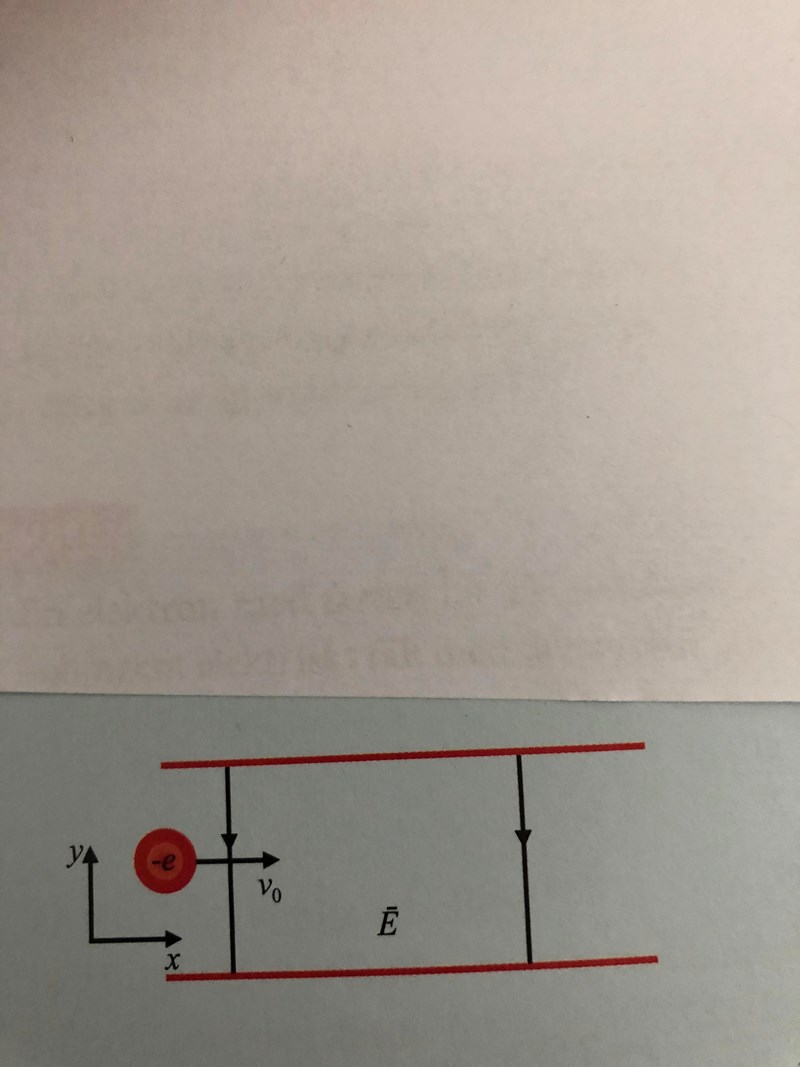 En graf ska tas fram för hur en elektron rör sig i ett homogent elektriskt fält. Figuren nedan ska man utgå ifrån. Elektronen rör sig initialt mot höger i ett elektriskt fält pekandes nedåt ä. Ditt diagram ska visa hur elektronen rör sig i en sådan figur.