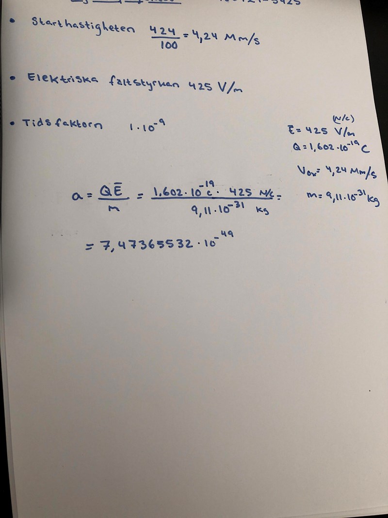 Jag tror att du ska beräkna elektronens bana genom att m.h.a. Excel beräkna elektronens läge vid 150 på varandra följande tidpunkter som skiljer sig åt med 10-9 s.
