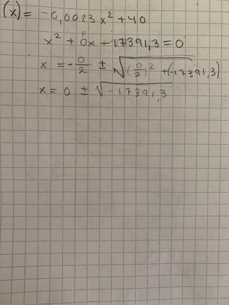 I det här fallet (när vi inte har någon x-term) är det lämpligt att skriva om ekvationen till 0,0023x2 = 40 innan man börjar lösa den. Men om du vill använda pq-formeln så skall det vara "-" mellan de båda termerna under rot-tecknet. Då får du nånting positivt att dra roten ur.