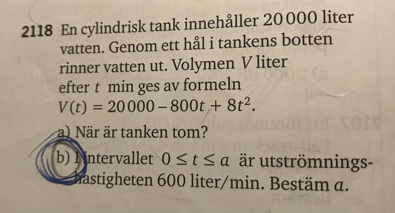 dvs utströmmningshastigheten kommer att vara störst vid t=0 (-800 l/min) och avta linjärt eftersom vattentrycket avtar, till 0 l/min vid t=50 (då den kvarvarande volymen är 0 liter). Precis som det borde vara. Men eftersom utströmningshastigheten vid t=0 är -800 l/min så blir det väldigt konstigt när man läser frågan.