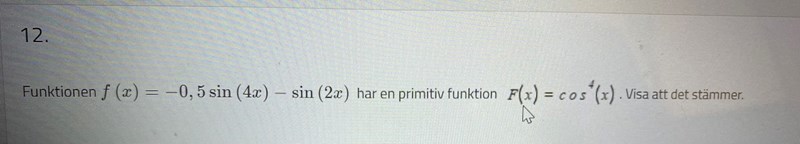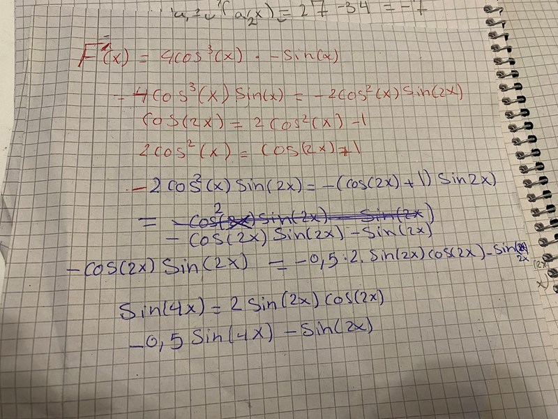 Jag har börjat med att derivera cos^4 (x) och jag fick 4cos^3(x) * -sin(x)