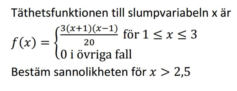 Så ser grafen ut. Jag vet inte vad arean mellan 3≥x>2,5 är, eller varför man ska ta reda på arean. Förstår inte vad man menar med ”0 i övriga fall” eller vad täthetsfunktion och slumpvariabel är.
