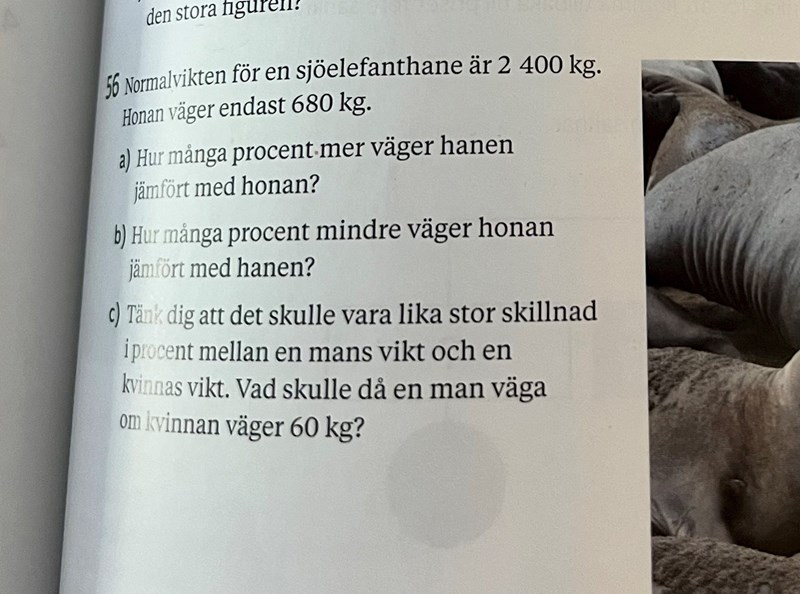 Hur stor är skillnaden i vikt mellan honan och hanen? Jag kallar detta för S. På a) skall du jämföra S med honans vikt, d v s S/680. På b) skall du jämföra S med hanens vikt, d v s S/2400.
