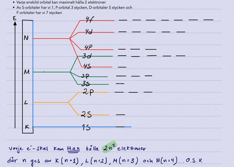 Var och en av de svarta linjerna (varje orbital) har plats för två elektroner. En atom innehåller lika många elektroner som det finns protoner i kärnan. Man börjar att fylla på i de orbitaler som har lägst energi, d v s finns längst ner i bilden.