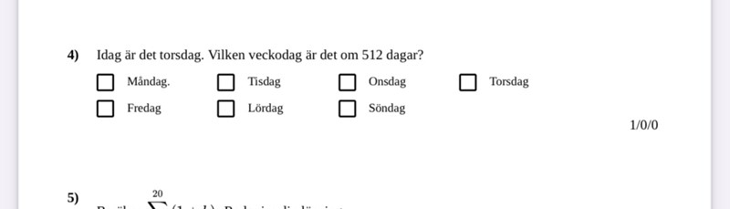 frågan: idag är det torsdag. Vilken veckodag är det om 512 dagar?