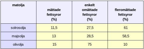 Jag har även kollat på fettsyrornas fördelning och fick fram den här tabellen