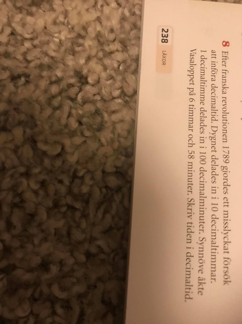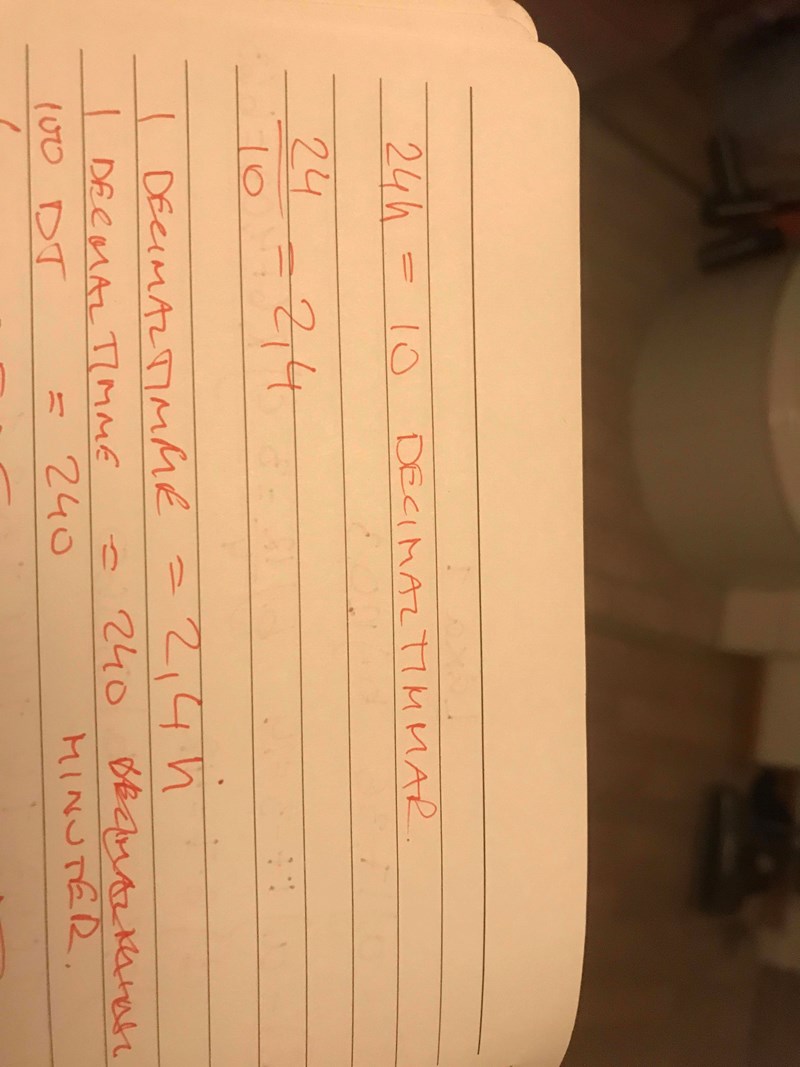 Det är en bra början! Om en decimaltimme är 2,4 timmar, hur många decimaltimmar är då sex timmar? Hur många minuter går det på 2,4 timmar? Hur många "vanliga minuter" blir över? Hur många minuter är en decimalminut?
