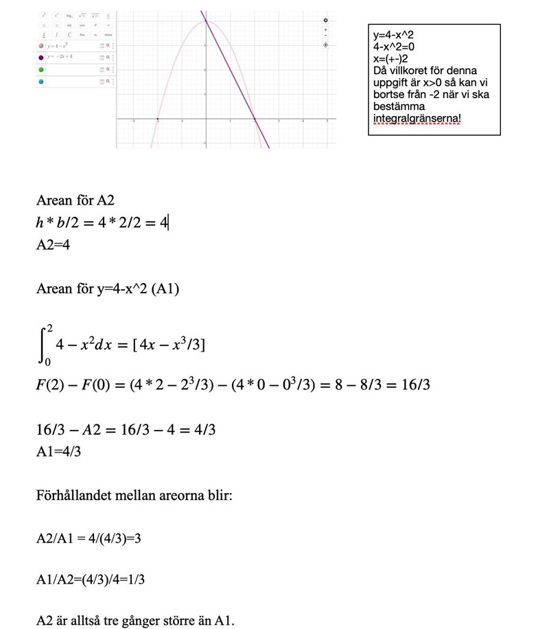 "Rita upp kurvan y = 4 - x^2 ; x > 0 Rita sedan en linje mellan kurvans skärningspunkt med y-axeln och dess skärningspunkt med x-axeln. Härvid uppkommer två st areor. Beräkna förhållandet mellan dessa båda areor.