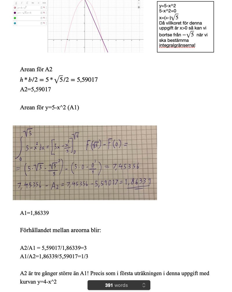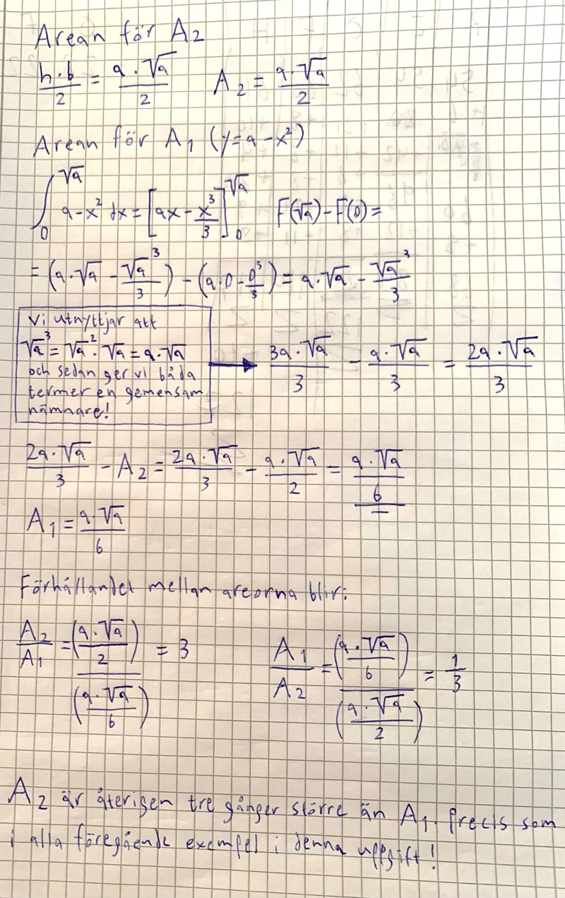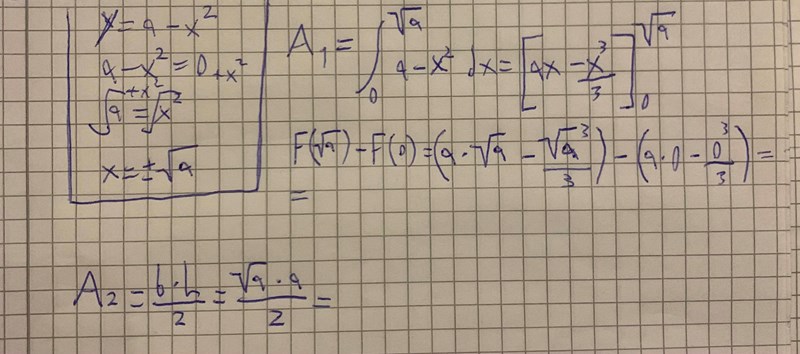 Det jag behöver hjälp med är den sista delen som jag har bifogat en bild på längst ner i inlägget. Där är jag helt fast. Jag har skrivit upp integralfunktionen för uträkningen av arean för A1 (y=a-x^2) och A2 (triangeln) men efter det är jag lite lost. Vet inte hur jag ska fortsätta räkna för att komma fram till ett svar.