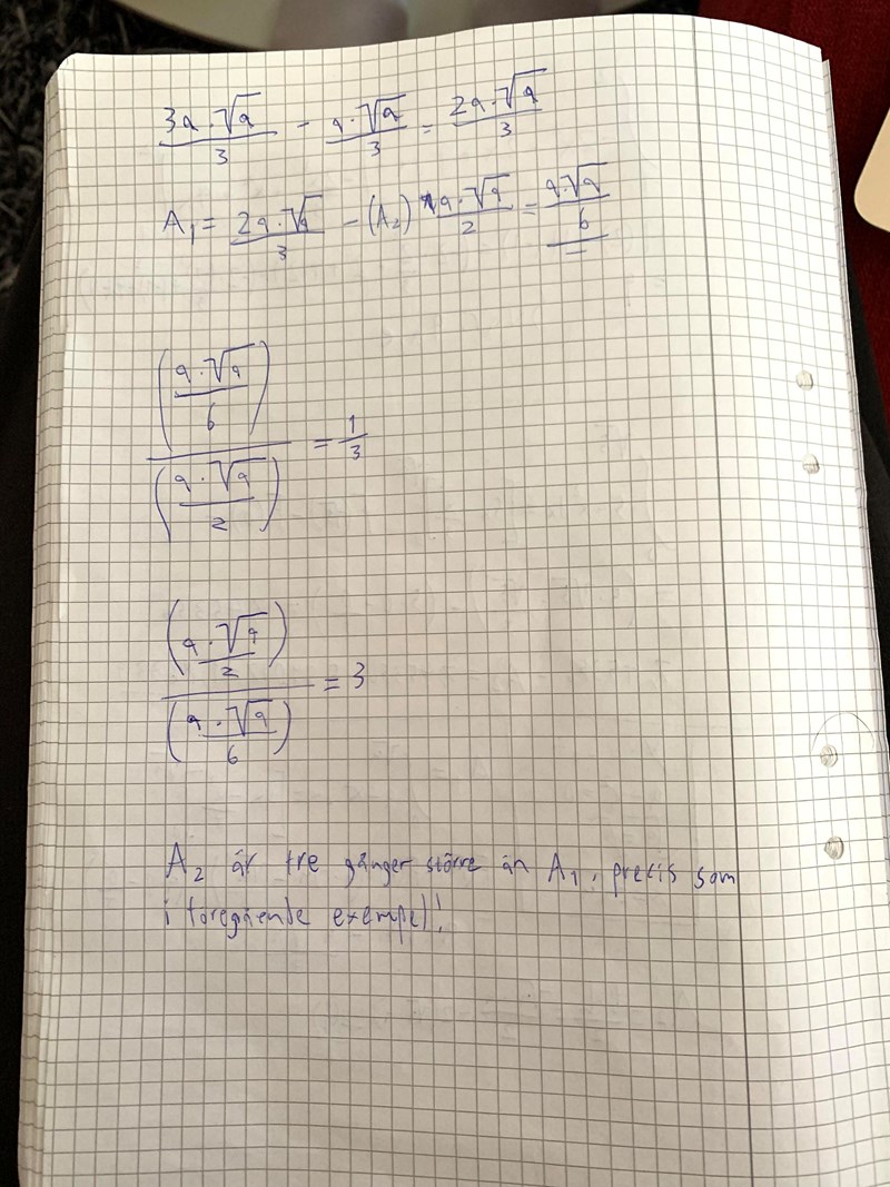 Baserat på din hjälp så är det här uträkningen som jag fick fram. Baserat på förhållandena mellan A2 och A1 tidigare i uppgiften så verkar allt stämma! När jag räknade ut förhållandet så tänkte jag a*a=1. Alltså 16/12. Det funkade men vet ej hur jag annars ska tänka när jag räknar ut det? När jag räknade ut A1-A2=a*a/6 så gjorde jag det men en kalkylator. Hur ska man kunna räkna ut det i huvudet? Ska man ställa termerna under gemensam nämnare? Hur gör man det i detta fall? Tack!