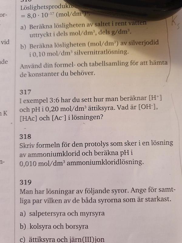 Hej! Jag skulle behöva hjälp med uppgift 318, med att bestämma pH. Jag har nämligen lite svårt att tolka frågan och vilken koncentration jag letar efter för att kunna göra om till det önskade pH-värdet. När jag ändå frågar, finns det någon bra metod att lära sig för att bli bra på att tolka dessa typer av uppgifter?