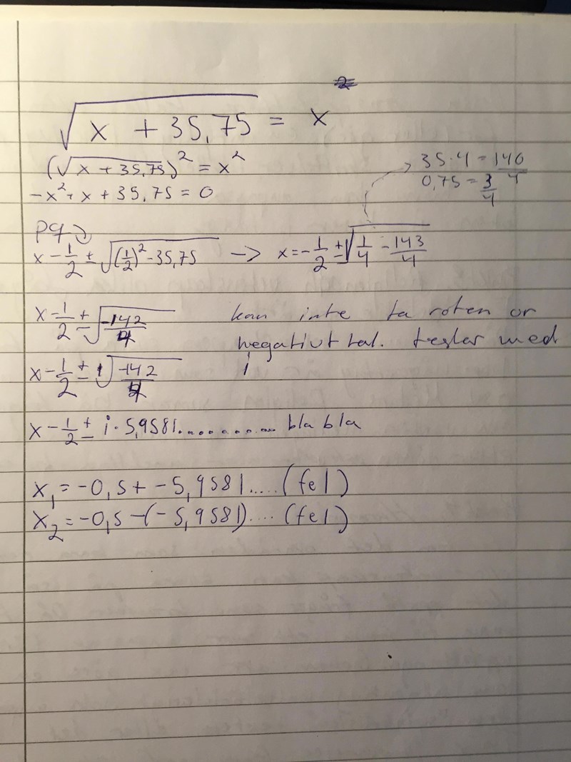 Smaragdalena skrev:Se till att du har "en osynlig etta" framför kvadrattermen inan du använder pq-formeln - med andra ord multiplicera hela ekvationen med -1 först.