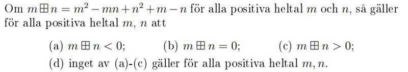 Du kan ju pröva några olika värden på m och n, för att se vilka värden du får ut. Försök att få ut både låga och höga värden; om du hittar något annat än noll är (b) eliminerad; om du kommer över noll är (a) eliminerad; om du kommer under noll är (c) eliminerad. Lyckas du inte eliminera ett visst alternativ, försök tänka logiskt kring varför du inte lyckas komma över/under/utanför noll.