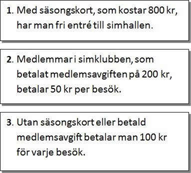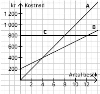 d) Hur kan du se att graf B visar det billigaste alternativet om du besöker simhallen 4 – 12 gånger?