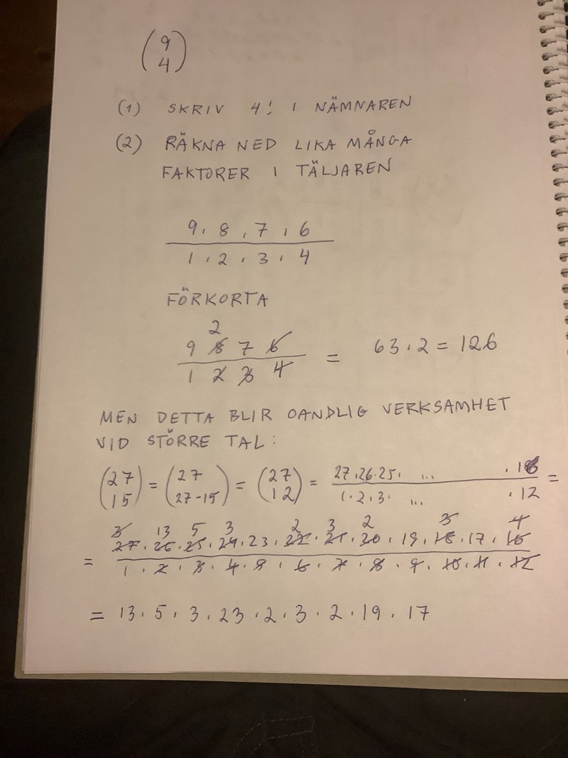 Det kan dock vara bra att känna till hur man snabbt beräknar ”n över k” för hand om man skulle behöva. Först skriver man ut k! i nämnaren. Därefter skriver man k st faktorer i täljaren, men nu räknar man nedåt med start vid n. Därefter förkortar man. Titta på bilden om du är intresserad.