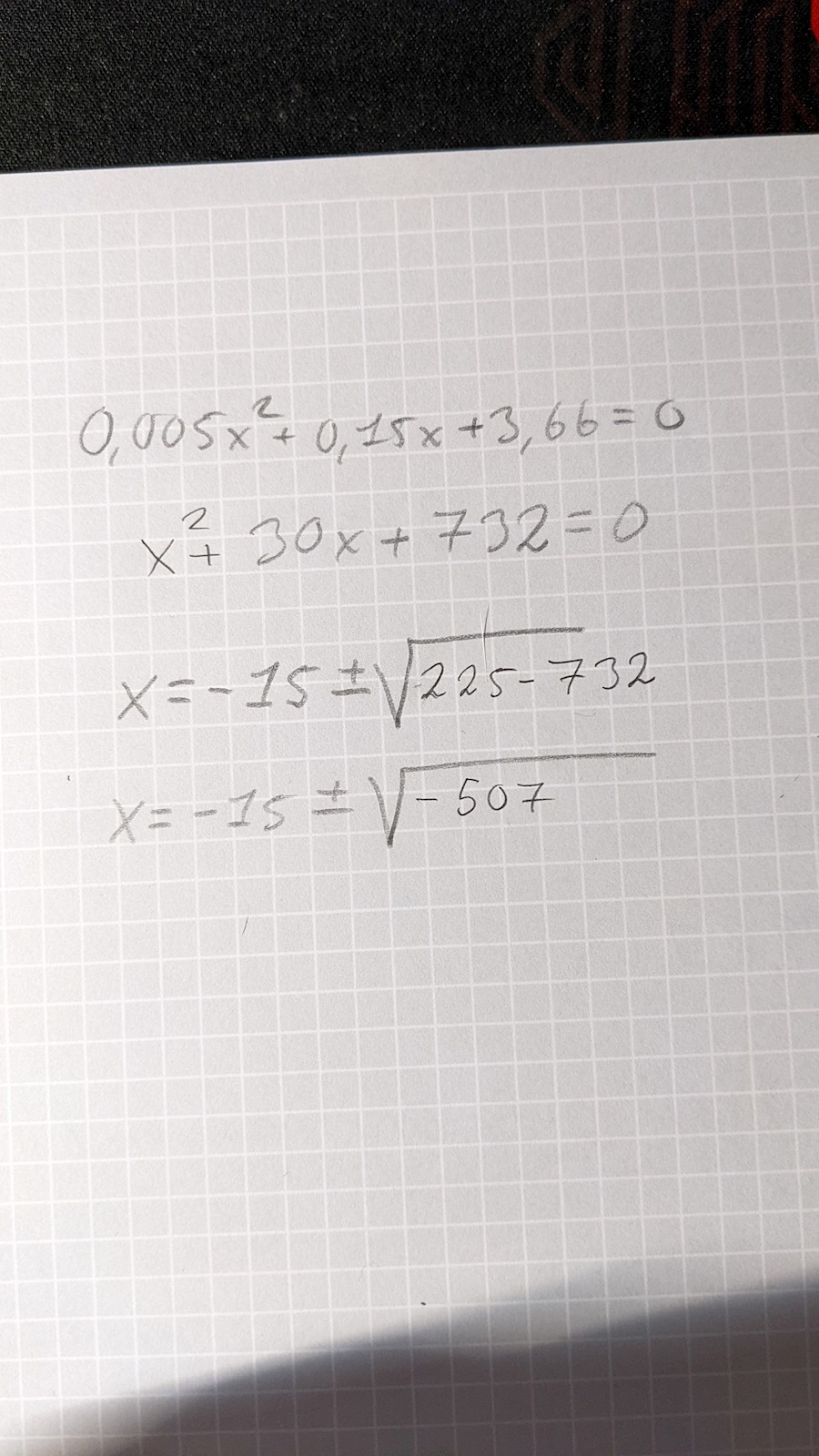 Tack för svaret. Sitter med detta igen, och försöker klura på hur jag ska gå tillväga. Har kommit såhär långt men enligt regeln om reella tal så kan jag ju inte komma vidare?