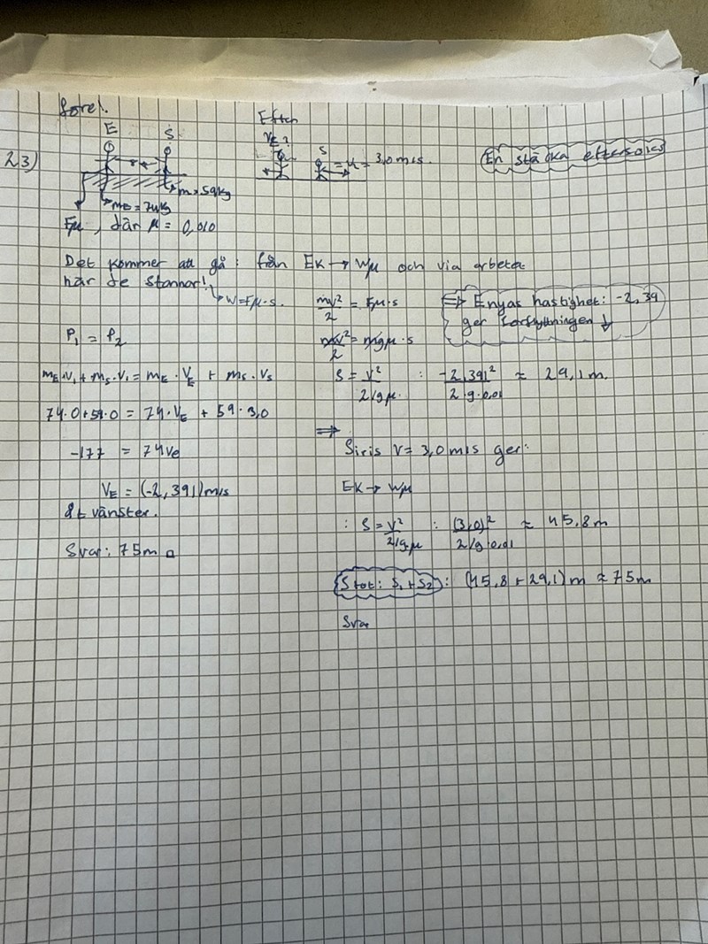 När du har deras resp fart kan du titta på rörelseenergin och hur friktionsarbetet hänger ihop.