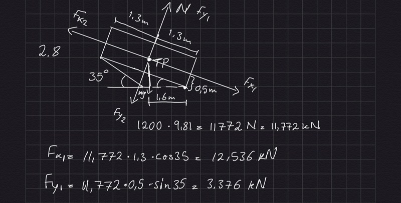 Hej, japp du har rätt har slarvskrivit lilla 35 grader sen tidigare och inte suddat bort men den inre vinkeln är okänd och höjden på flaket är 1 meter så det borde inte väl spela roll om man multiplicerar in den på Fy. sedan ska Fy och Fx vara i kN.