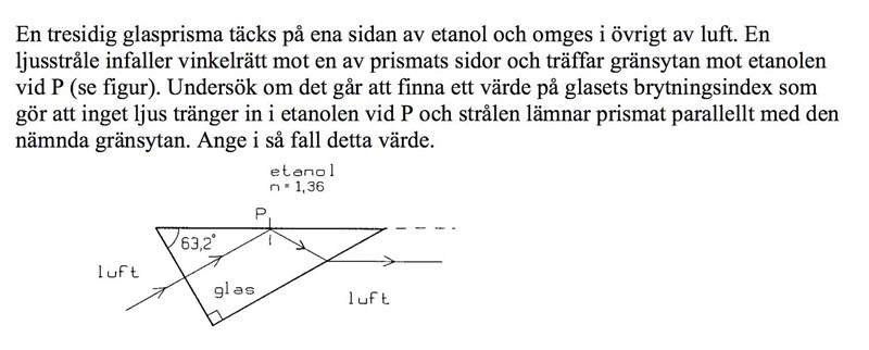 - För att få totalreflektion mellan glas och etanol krävs ett högt brytningsindex - ställ upp ett uttryck för hur högt.