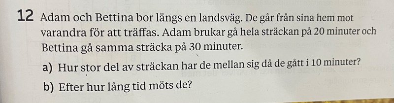 Hur stor del av sträckan går Adam och Bettina i tio minuter om vi tänker att hela sträckan är 6x?