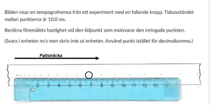 Nedan är en bild på tempografen. Om det är 1cm mellan två streck så har föremålet fallit 1cm på 10ms. Hur stor hastighet är det?