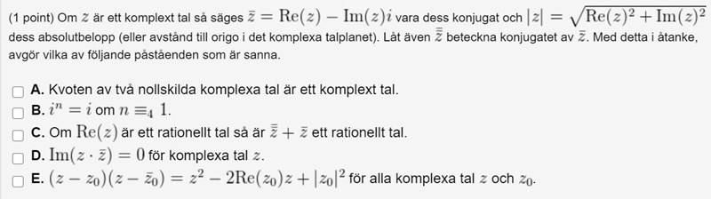 A: Det är inte sant, eftersom ett komplext tal behöver inte ha en imaginär del, den imaginära delen kan vara 0.