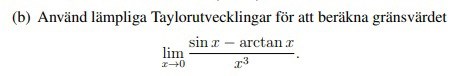 Min tanke rent spontant (och finns ett tips om en liknande uppgift) är att man ska använda Taylorutvecklingen för sin x och arctan x kring x=0 till grad 3, pga x^3 i nämnaren och att gränsvärdet går mot 0. Och det jag undrar är om man behöver ha med resttermen? I tipset har de med resttermen som big-O notation (ordo), men de kommer ju i slutändan ta ut varandra så behövs den även om man inte ska bestämma resttermen? Eller måste man ha med resttermen för att det ska vara matematiskt korrekt?