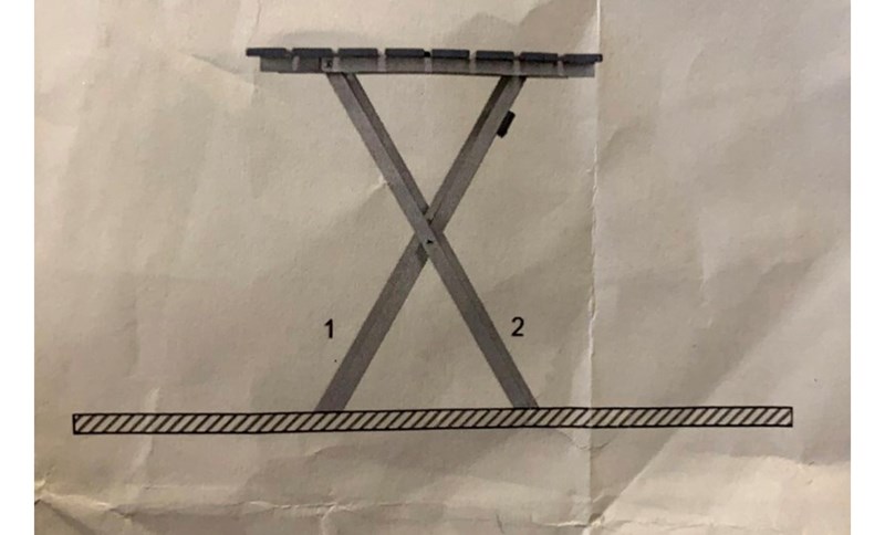 Benen på bordet är hopskruvade i mitten. Men snickaren gjorde av misstag ben 1 lite längre än ben 2. Åt vilket håll lutar bordet? Bordet står på ett plant underlag. Motivera med beräkningar.
