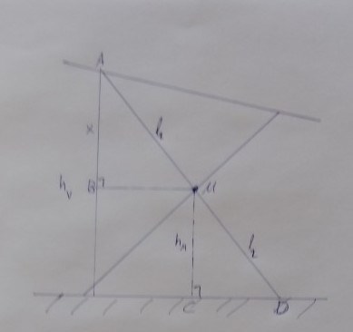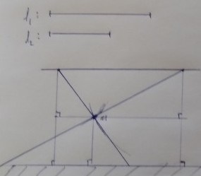 Jag utgår från en figur där jag tolkar solskenets "det är mot ben 2 bordet kommer luta" som att bordsskivan är lägre till höger i bilden. I mina figurer har jag kallat benlängderna för resp vilket gör att hypotenusorna i de trianglar jag betraktar får längderna resp. . Jag kallar höjden vid den vänstra fastsättningen i bordsskivan för och den vid högra fastsättningen för . I och med att jag ritar figuren under antagandet att bordsskivan lutar "åt höger" så ser man inte att trianglar är likformiga utan man måste lita på beteckningarna i figuren. En mer skalenlig (och extrem) figur finns (dolt) sist i inlägget.