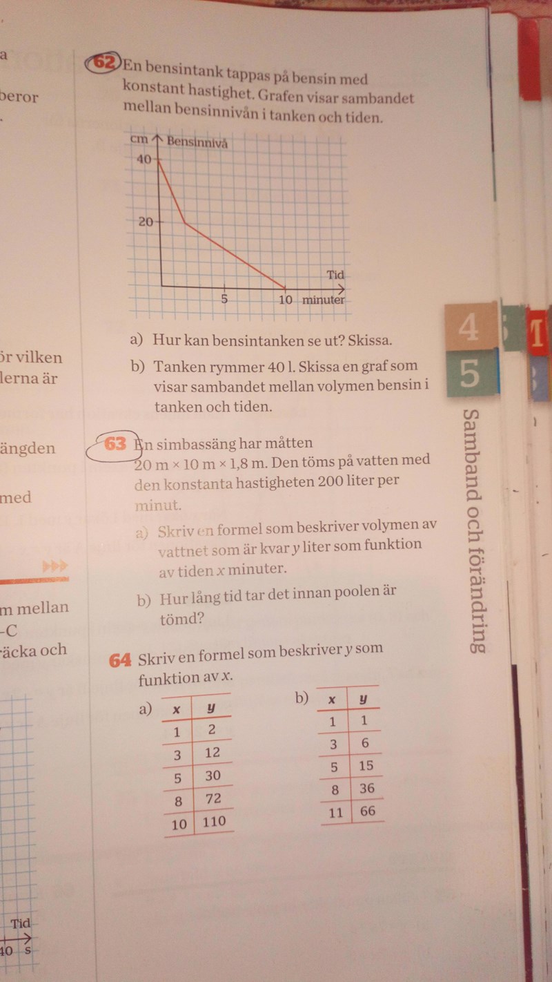 "Skissa en graf som visar sambandet mellan volym bensin i tanken och tiden"