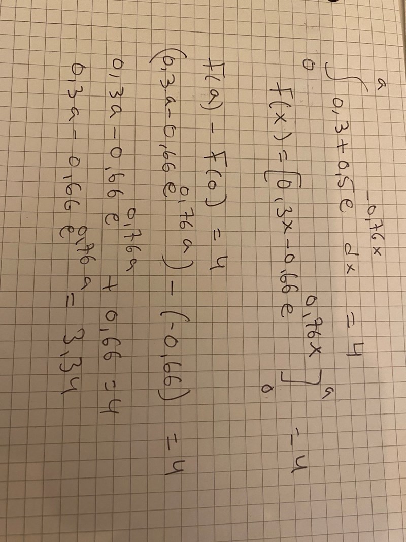 Då kan vi göra en ny ekvation för integralen i intervallet från 10 till a. Den ska bli återstående bensin efter x=10, dvs 4-3,658: