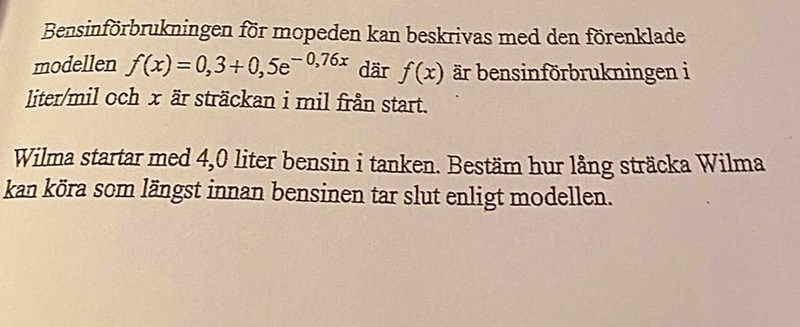 jag tänkte att jag lägger f(x)= 4 för att hon startade med 4 liter bensin och utifrån det räknar ut x men har en känsla att det är mer komplicerad än så och att man ska göra på ett annat sätt?