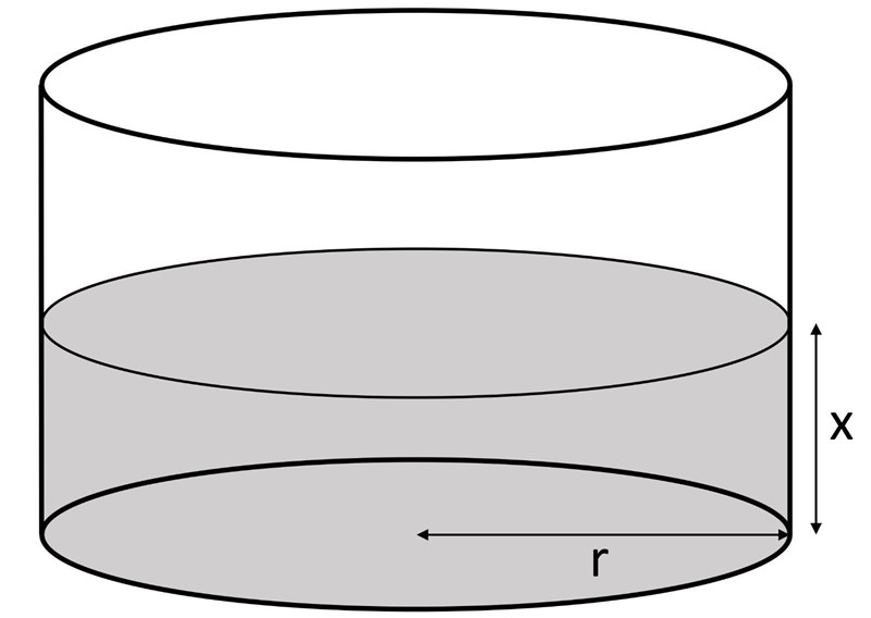I en burk med en cirkulär botten hälls 4.33 liter vatten. Bestäm sträckan x i bilden nedan om bottenradien r är 6.943 cm.