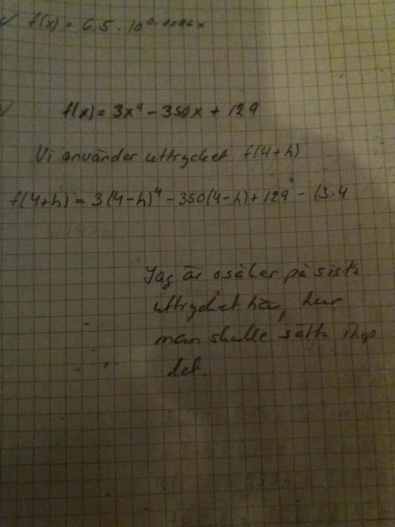• Du har skrivit upp differenskvoten ((4+h)^4-(4)^4)/h. Den har inget med saken att göra.