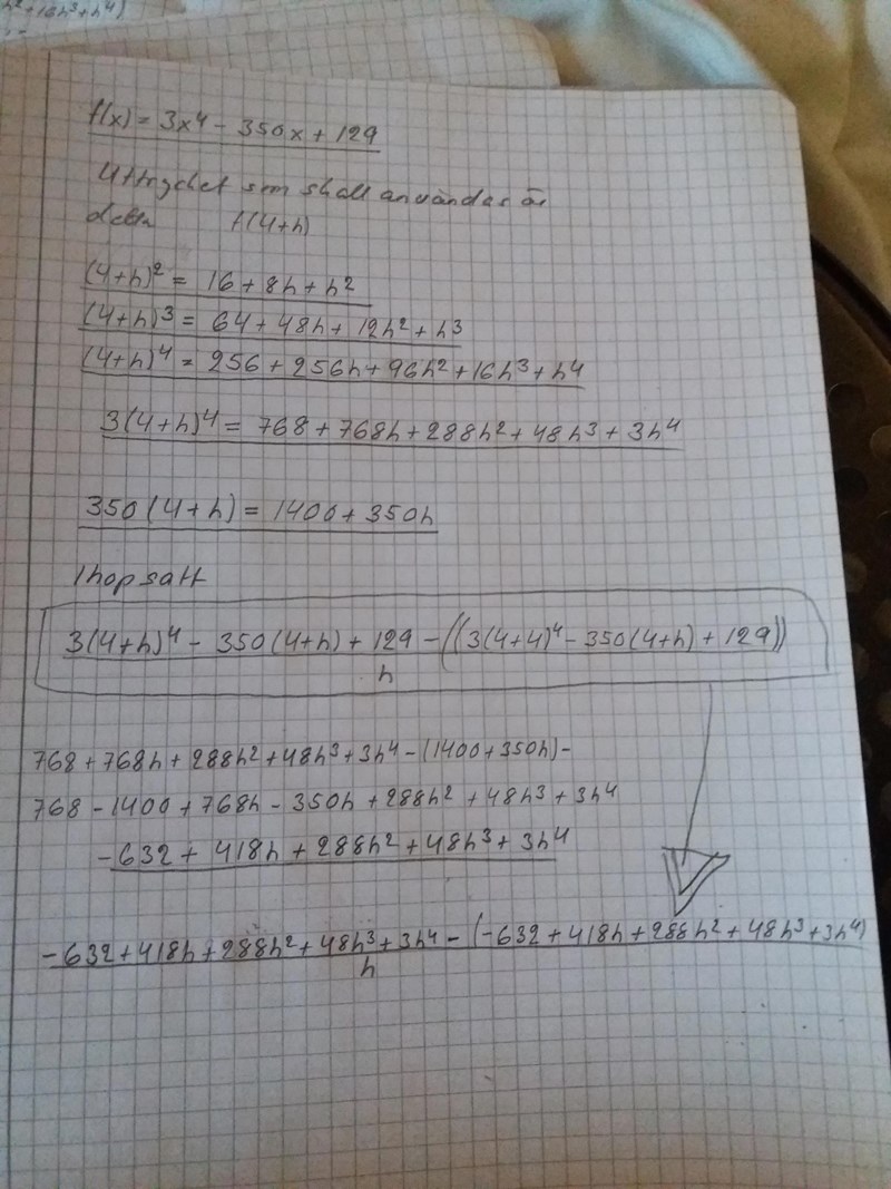 Du har beräknat 3(4+h)4 3(4 + h)^4 korrekt, men sen har du börjat slarva lite. För att underlätta och att du inte ska få in massor med slarvfel så är det bra om du delar upp problemet i delproblem, det är ungefär detta Yngve vill att du ska göra.