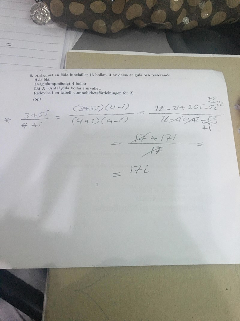 Du verkar ha löst en helt annan uppgift än den som är i frågan. Jag ser inga likheter mellan sannolikhetsuppgiften man frågar efter och den komplexa beräkning du har gjort - dessutom har du gjort fel när du har beräknat värdet. Det stämmer att uttrycket kan förenklas till , men sedan kan du bryta ut 17 i täljaren och förkorta det till .