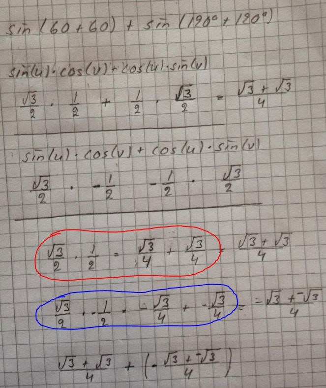 Du verkar ha räknat ut att sin(120) + sin(240) = 0, och det stämmer.