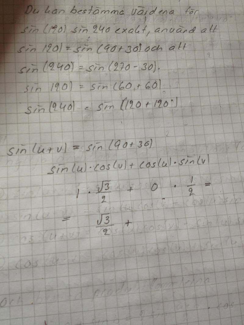 Vad är det du tycker är konstigt med uppgiften? Använd enhetscirkeln för att avgöra hur sin 120 grader och sin 240 grader förhåller sig till sin 60 grader (+ eller -). Använd "en halv liksidig triangel" för att ta reda på de exakta värdena för sin 120 grader och sin 240 grader. Sätt in de exakta värdena i additionsformeln och förenkla.
