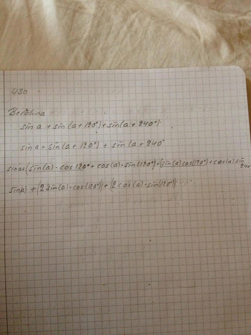 sin (a) + sin(a+120°) + sin ( a+ 240° )---------------------sin(a) +  ( sin(a)·cos(120) + cos(a)·sin(120)   +    sin(a)·cos(240)+cos(a)·sin(240)cos120=-0,5sin 120=0,866025cos 240=-0,5sin 240=-0,866025--------------