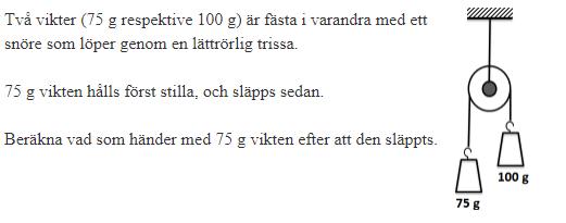 Vikten dras ner med en kraft på 0,7365N och upp med en kraft på 0,982N därmed så dras den upp men en kraft på 0,2455N för att få a så delar vi med massan 0,075kg och får att a=3.27333 vilket är fel. Vad är det som ha blivit fel i lösningen?